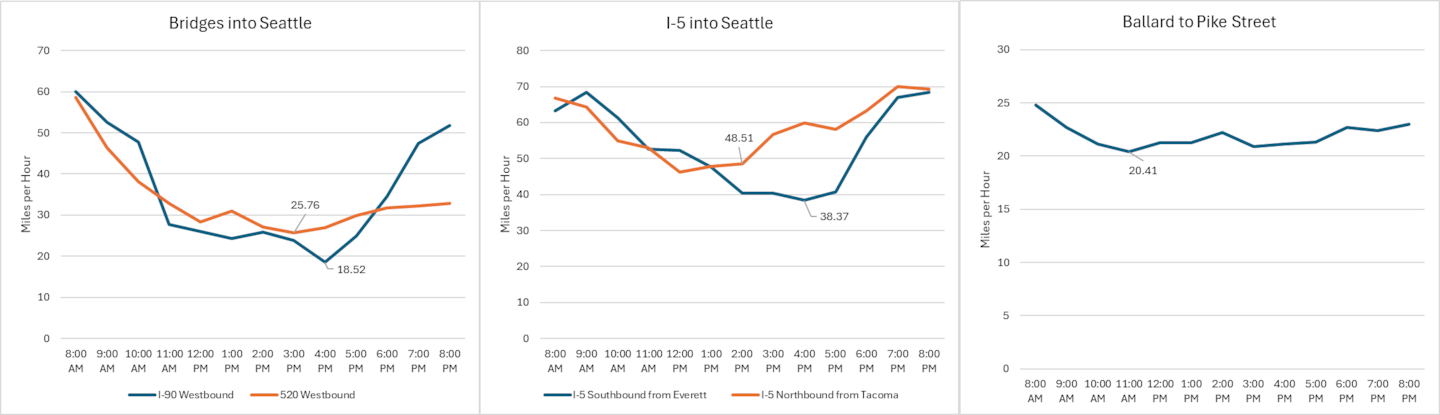 Pishue expects I-90 to be the most congested route into the city, followed by SR 520, with southbound I-5 moving more slowly than northbound lanes.