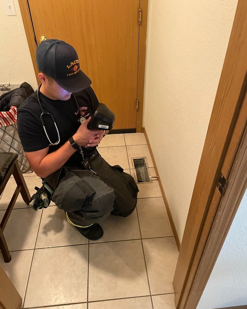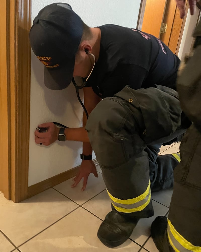 Firefighter Harn used a stethoscope to listen for the cat’s movement, while firefighter Anderson played “cat calling” sounds to coax it into meowing to pinpoint a location in the wall.
